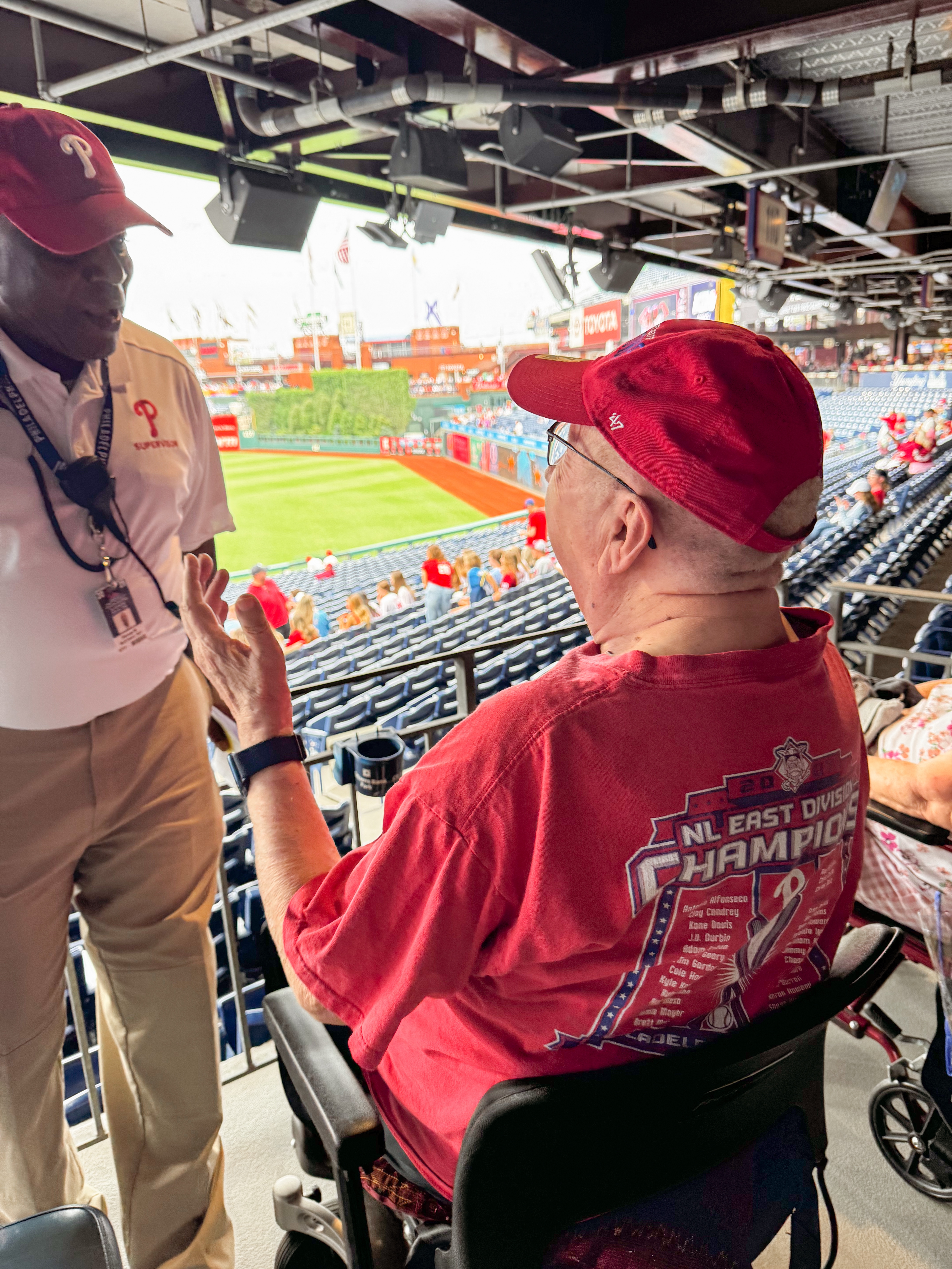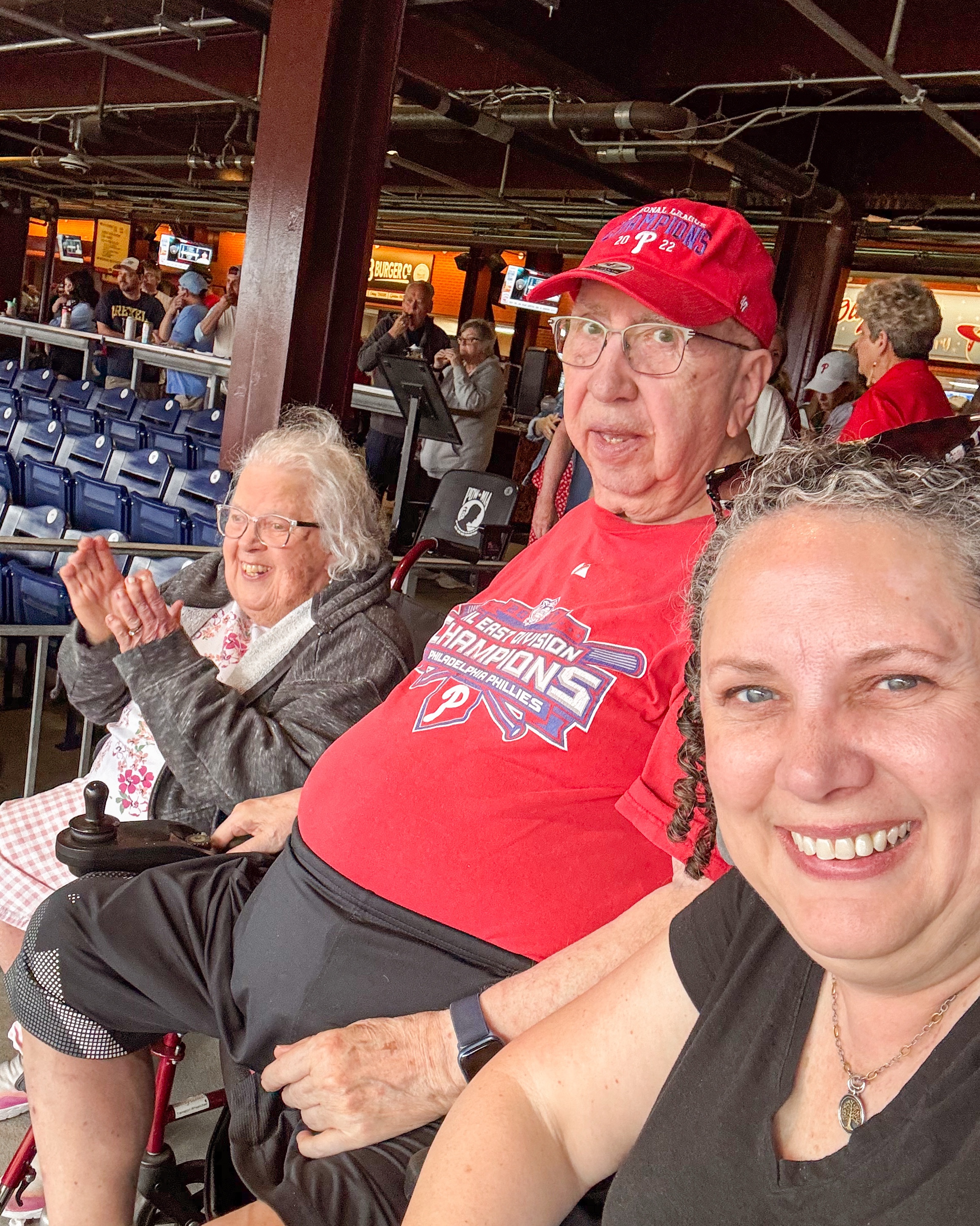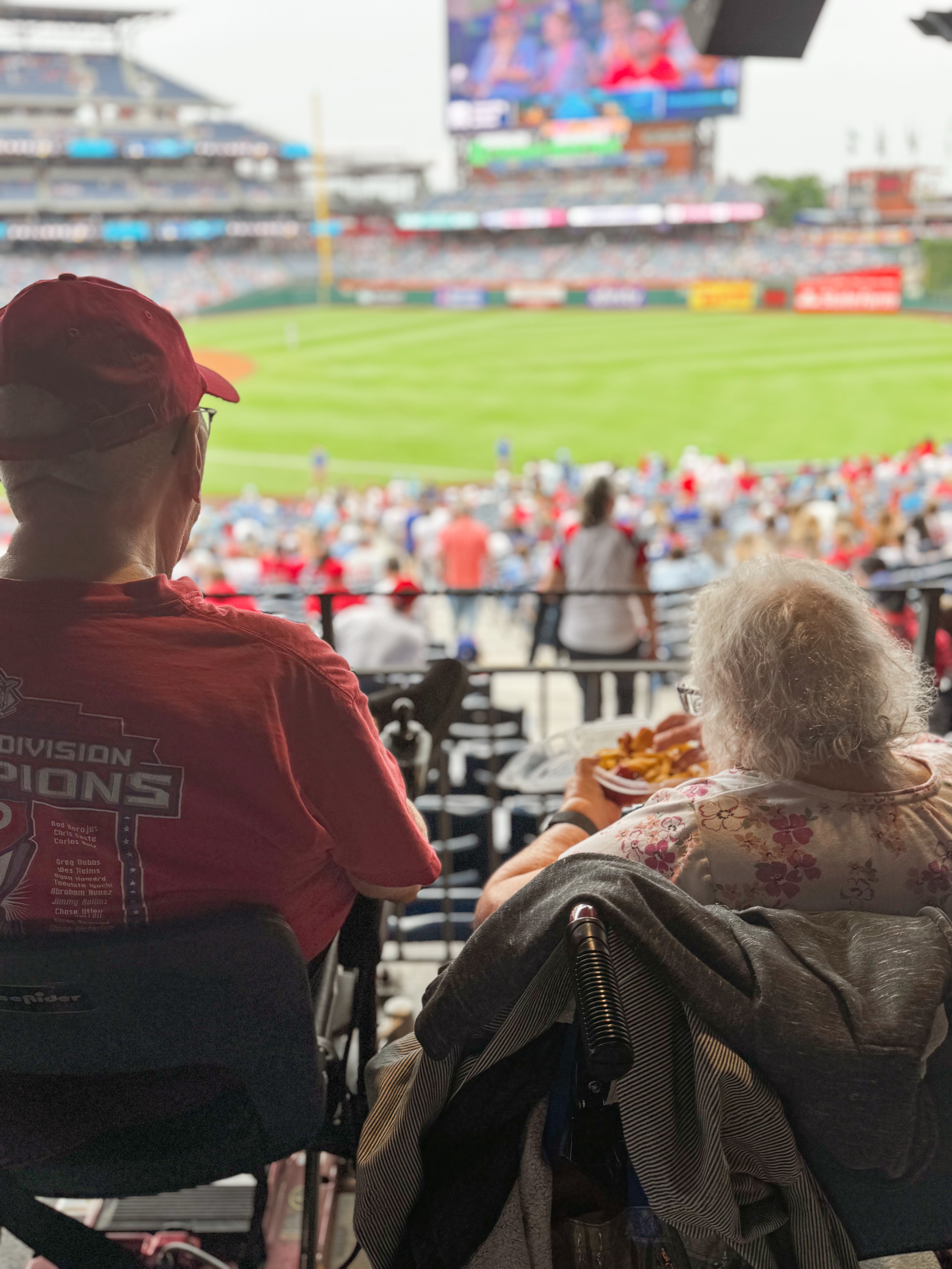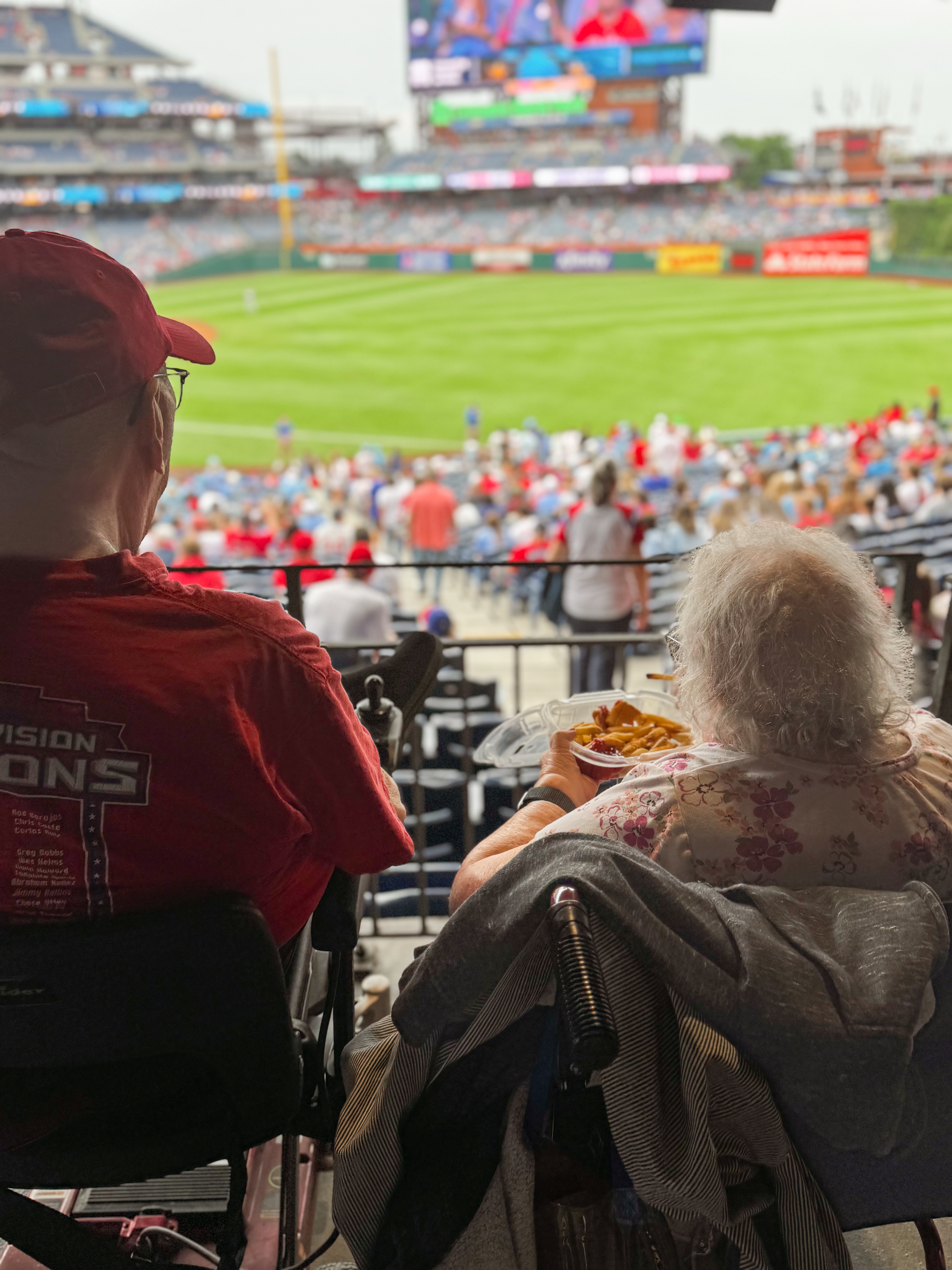 I have gotten things down when traveling with my parents and know their limitations. However, I have never traveled to a sporting event with them before, which presented a unique set of challenges. So, I had to carefully think through the logistics of getting them to their seats easily while ensuring they were comfortable throughout the experience. After thoroughly looking at the map of Citizens Bank Park and considering various parking options, I decided to park in lot P. It is both handicap and preferred parking, which was perfect for our situation. My parents are mobile, but long walks with lots of people bustling around is not ideal for them. My dad has an electric scooter, which significantly eased the burden of travel, so we utilized that. Additionally, we were fortunate to borrow a wheelchair for my mom from one of their neighbors, ensuring she could navigate the venue with ease. Both modes of transport turned out to be perfect solutions for our needs. We approached the entrance across from the parking lot, allowing us to avoid any unnecessary fatigue. Once inside, we were able to go straight to our seats without any hassles, which contributed to a much more enjoyable experience. The staff in the area to help us were amazingly attentive and helpful during the game, offering assistance whenever needed, which made the game even more pleasant. They went above and beyond in ensuring my parents felt welcomed and supported, which truly made this outing memorable for all of us.
