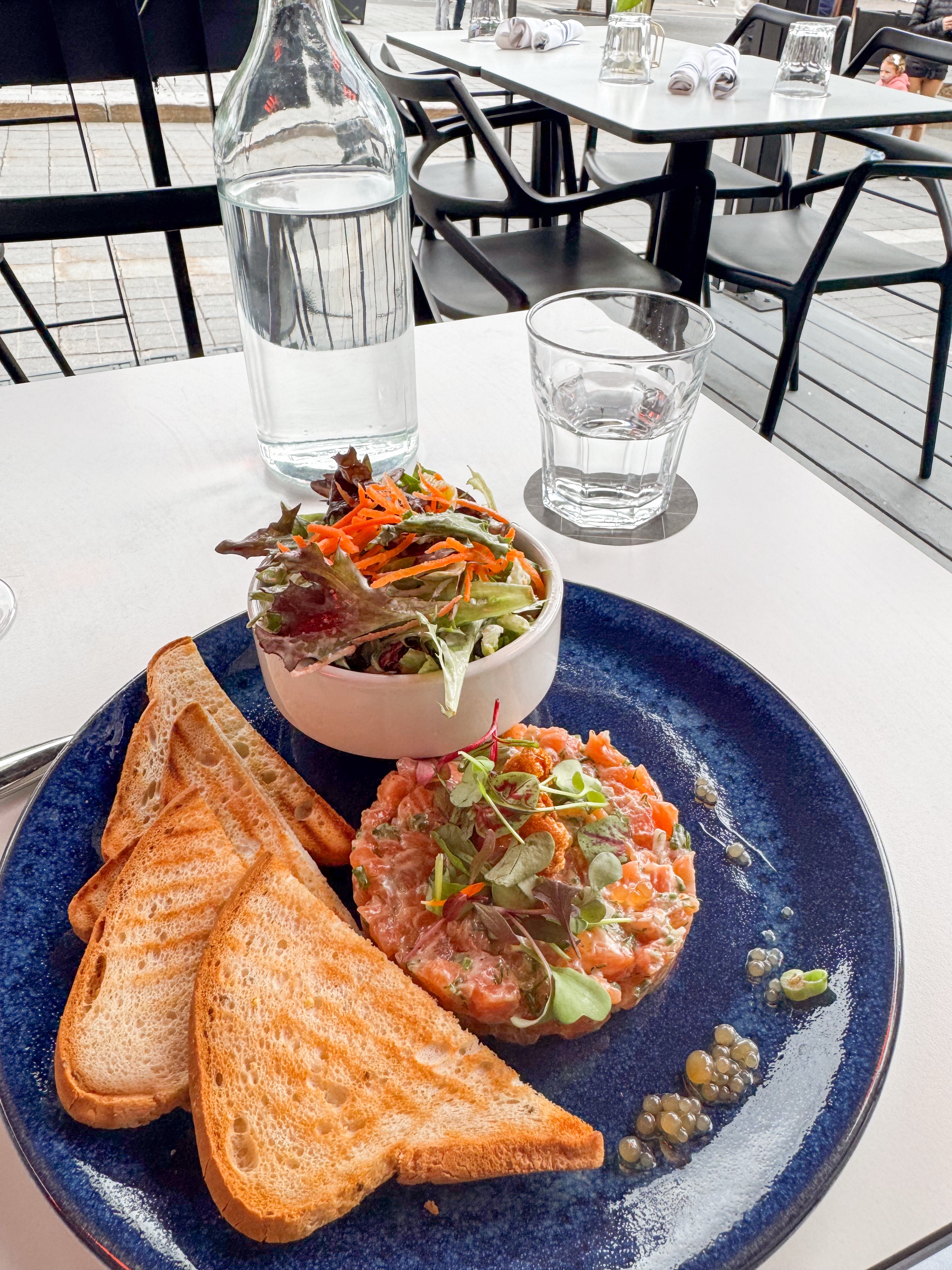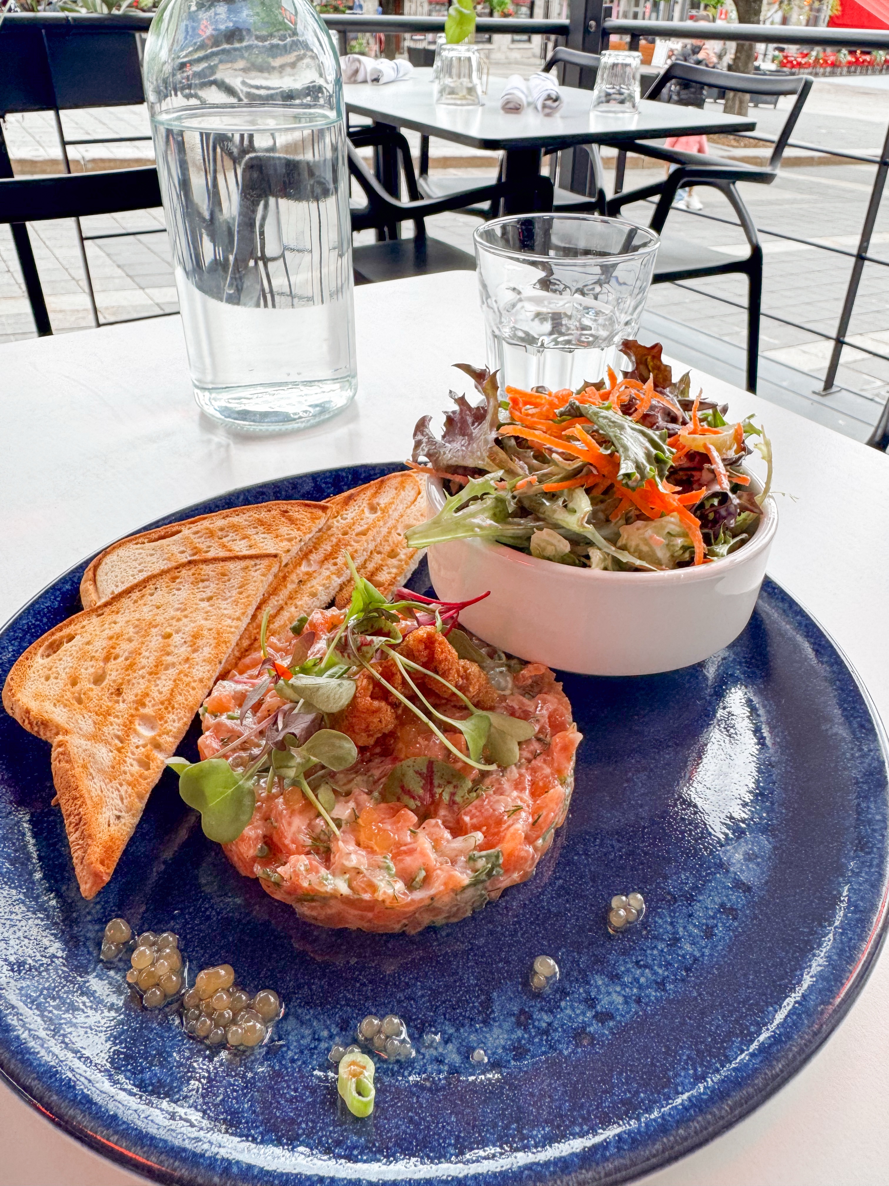 I had time in my schedule, and after exploring the charming streets of Old Montreal, filled with vibrant history and culture, I settled on Maggie Oakes, a quaint eatery known for its delightful ambiance and delicious cuisine. It was truly a great choice and perfect for what I needed at that moment. I visited at the end of May, when the weather was still a little chilly for the season, but that did not deter my spirits. Eager to enjoy the fresh air, I opted to sit outside, where I could soak in the surroundings despite the cool breeze. Under the warmth of the patio heater, I savored my meal, each bite enhanced by the beautiful atmosphere and the gentle sounds of the bustling streets around me.