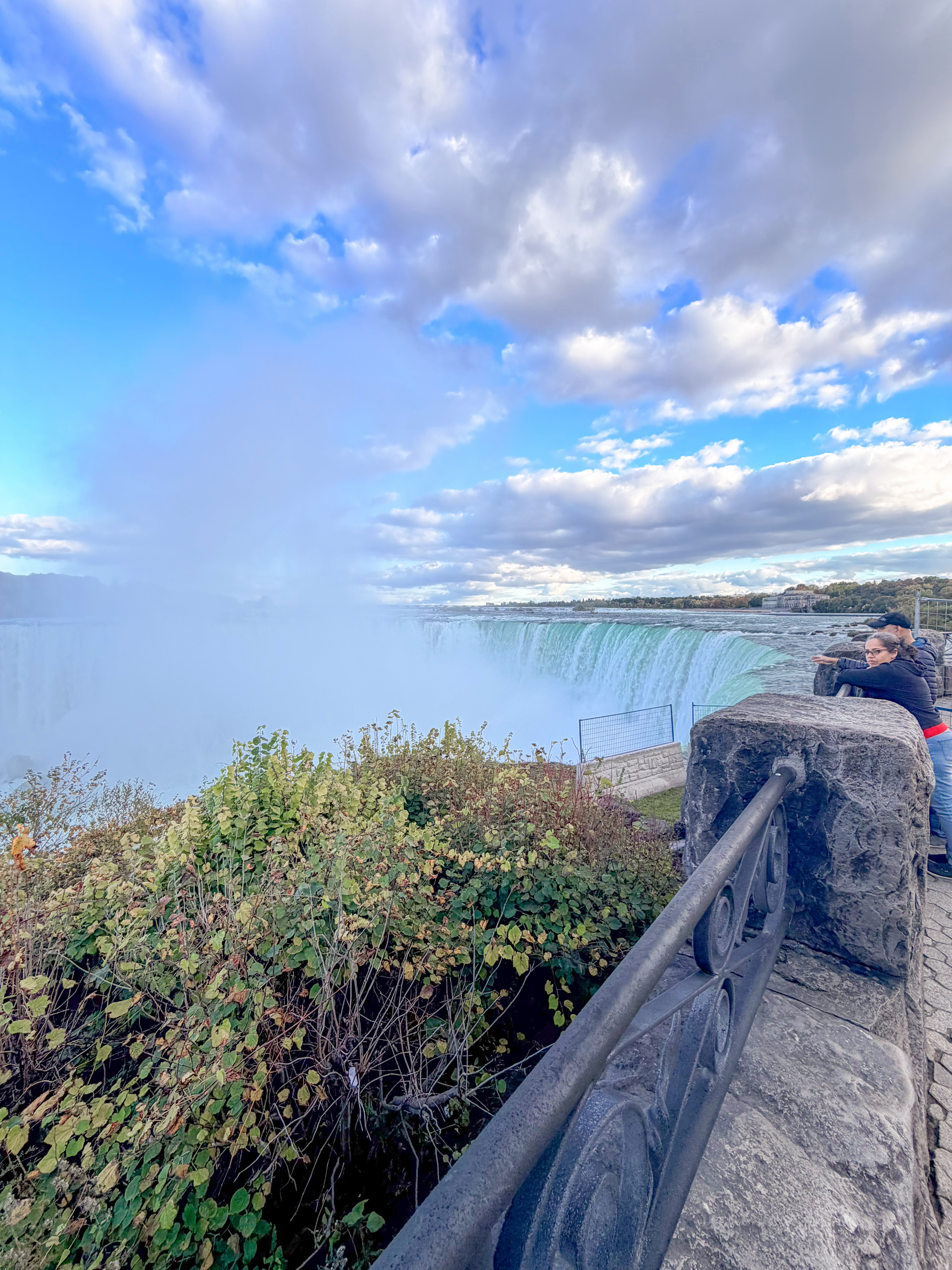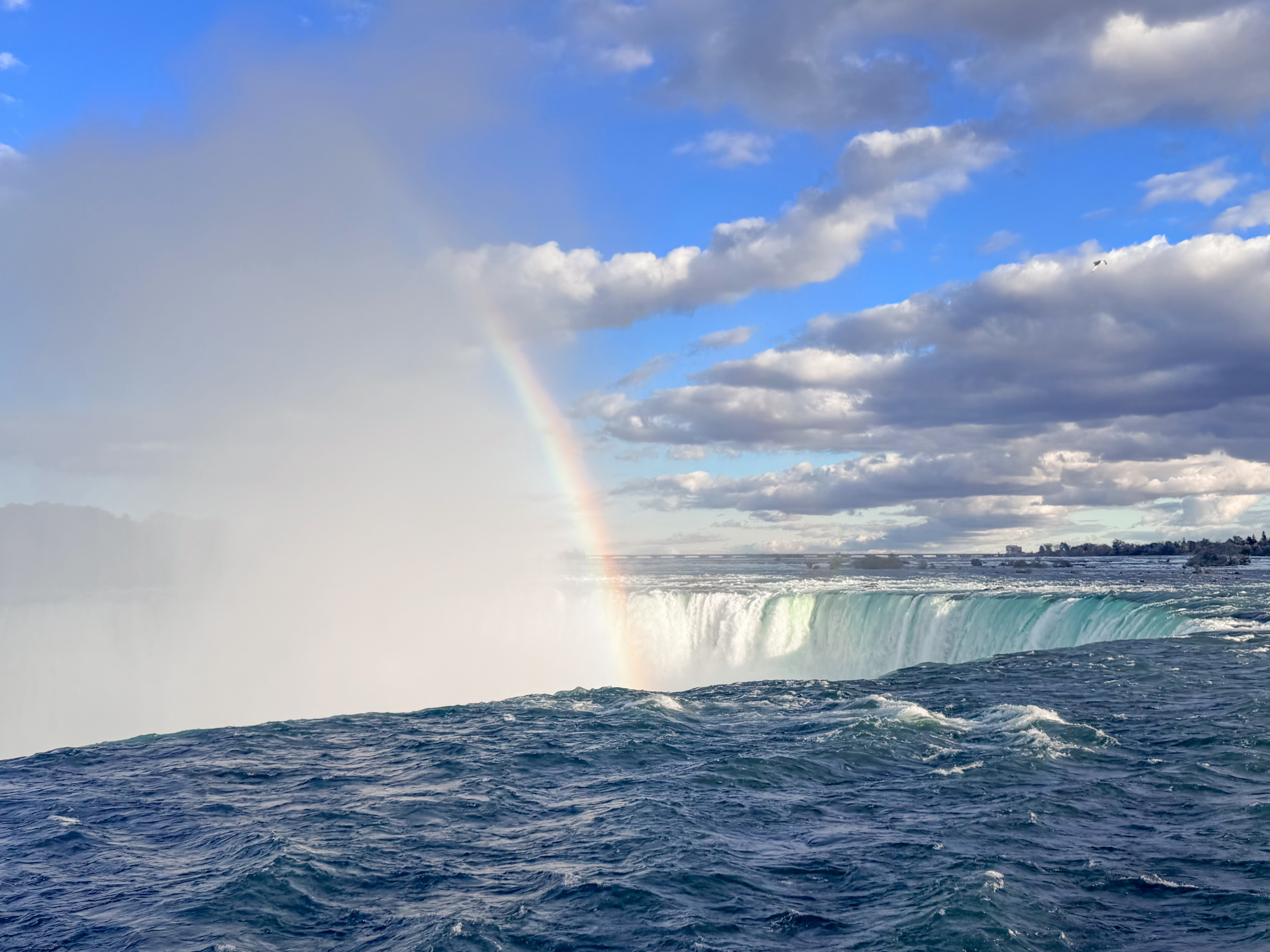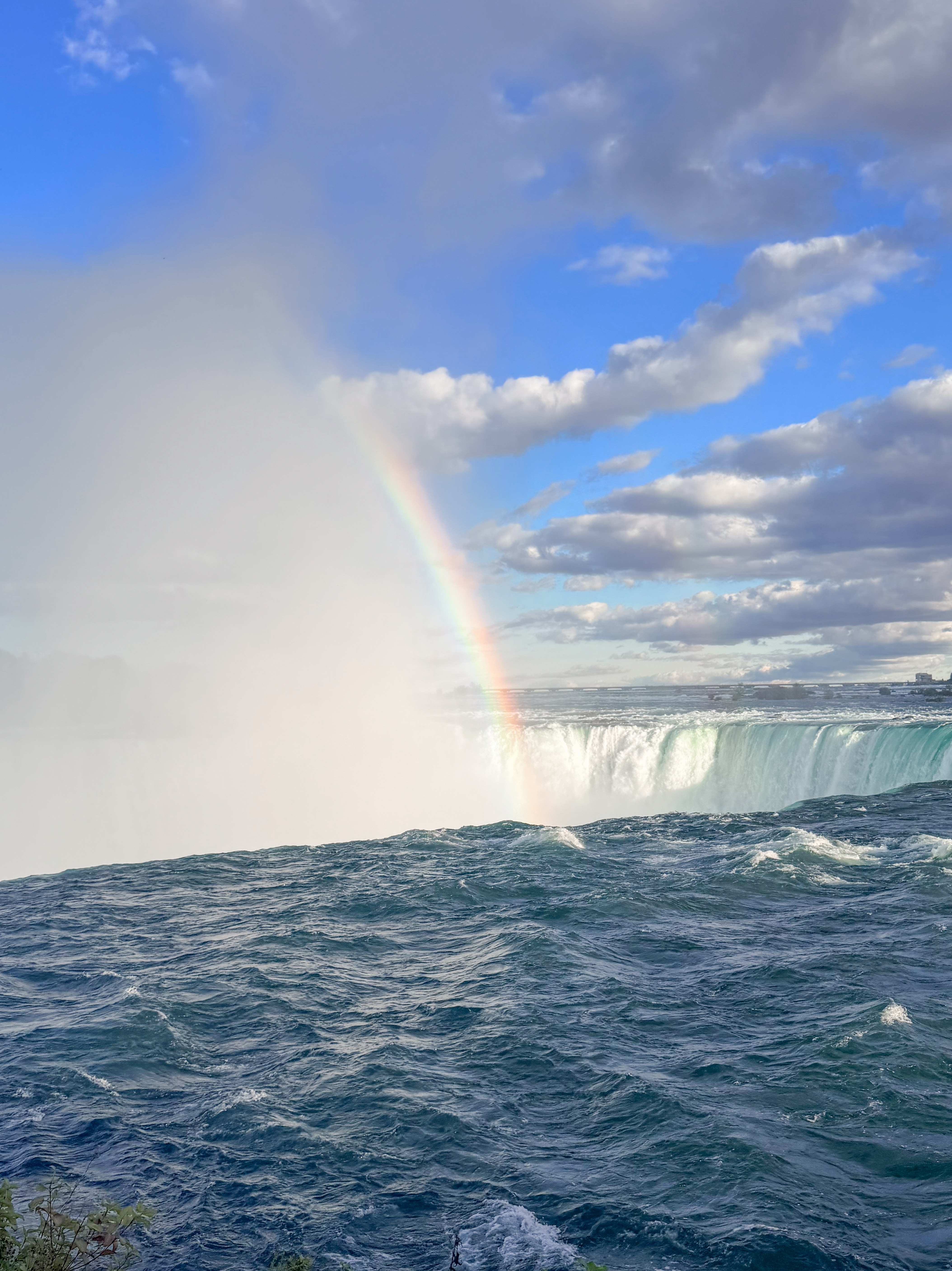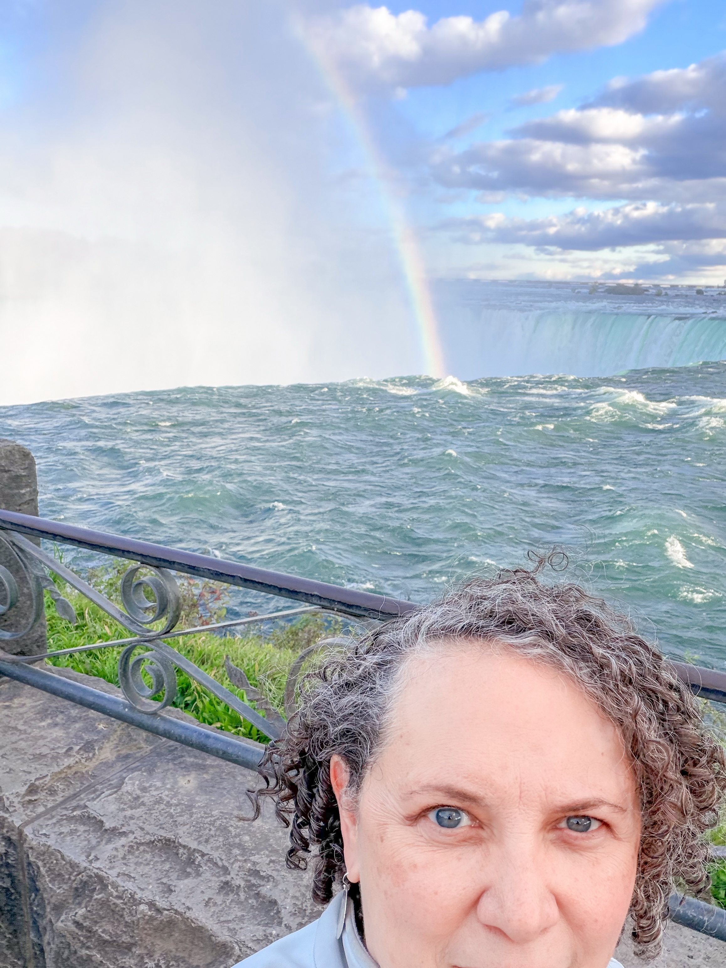 Since we were an hour and a half from Niagara Falls, we decided to visit, knowing that this iconic destination was a highlight of the area. There was rain in the morning, casting a gloomy atmosphere, and since it was in the forecast for other days, we felt this might be our only chance to experience the falls during our trip. After our visit to Cutco Cutlery, where we enjoyed learning about their products and craftsmanship, we set out on a scenic drive filled with anticipation. The landscape was beautiful, and we were delighted to cross the border to view Niagara Falls from the Canadian side, renowned for its breathtaking views. Upon arriving, we found a perfect parking spot, which was a stroke of luck considering how busy the area can get. I quickly made my way to the edge of the falls, feeling the mist on my face and the excitement building as I aimed my camera to capture the stunning visuals. To my delight, there was a vibrant rainbow arcing across the spray of the falls, which made the moment even more magical and memorable. I loved seeing it, as it seemed to embody the beauty and raw power of nature right before me.