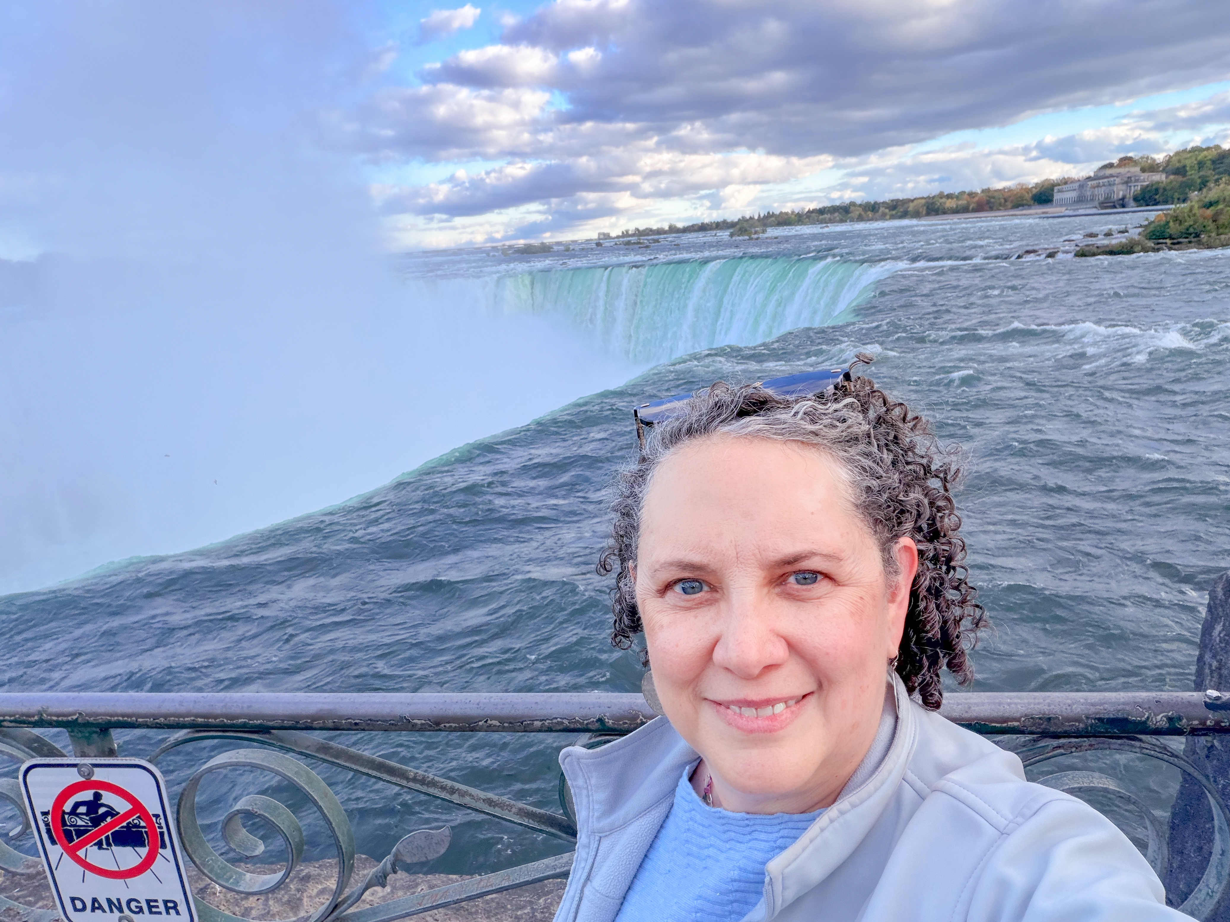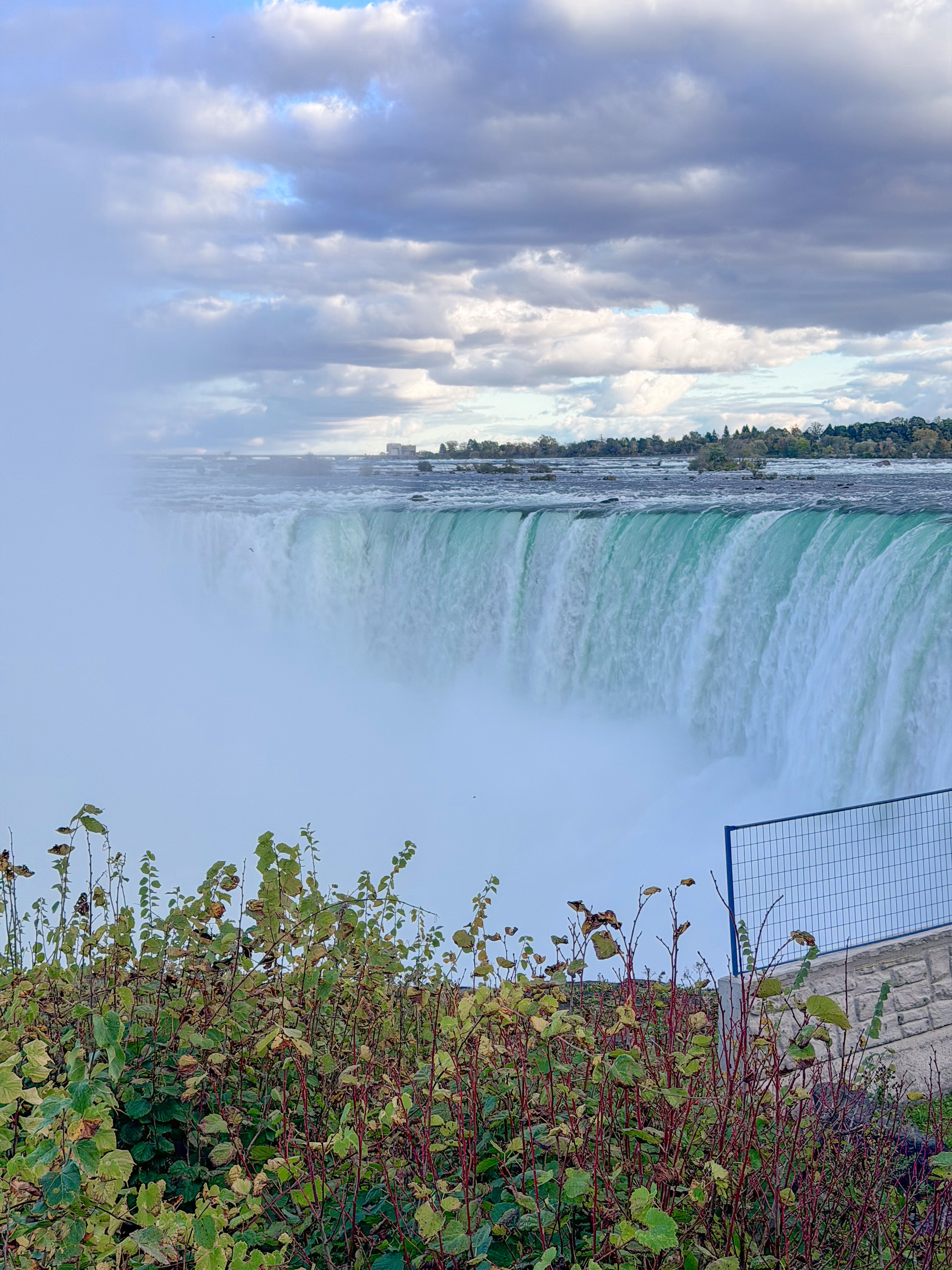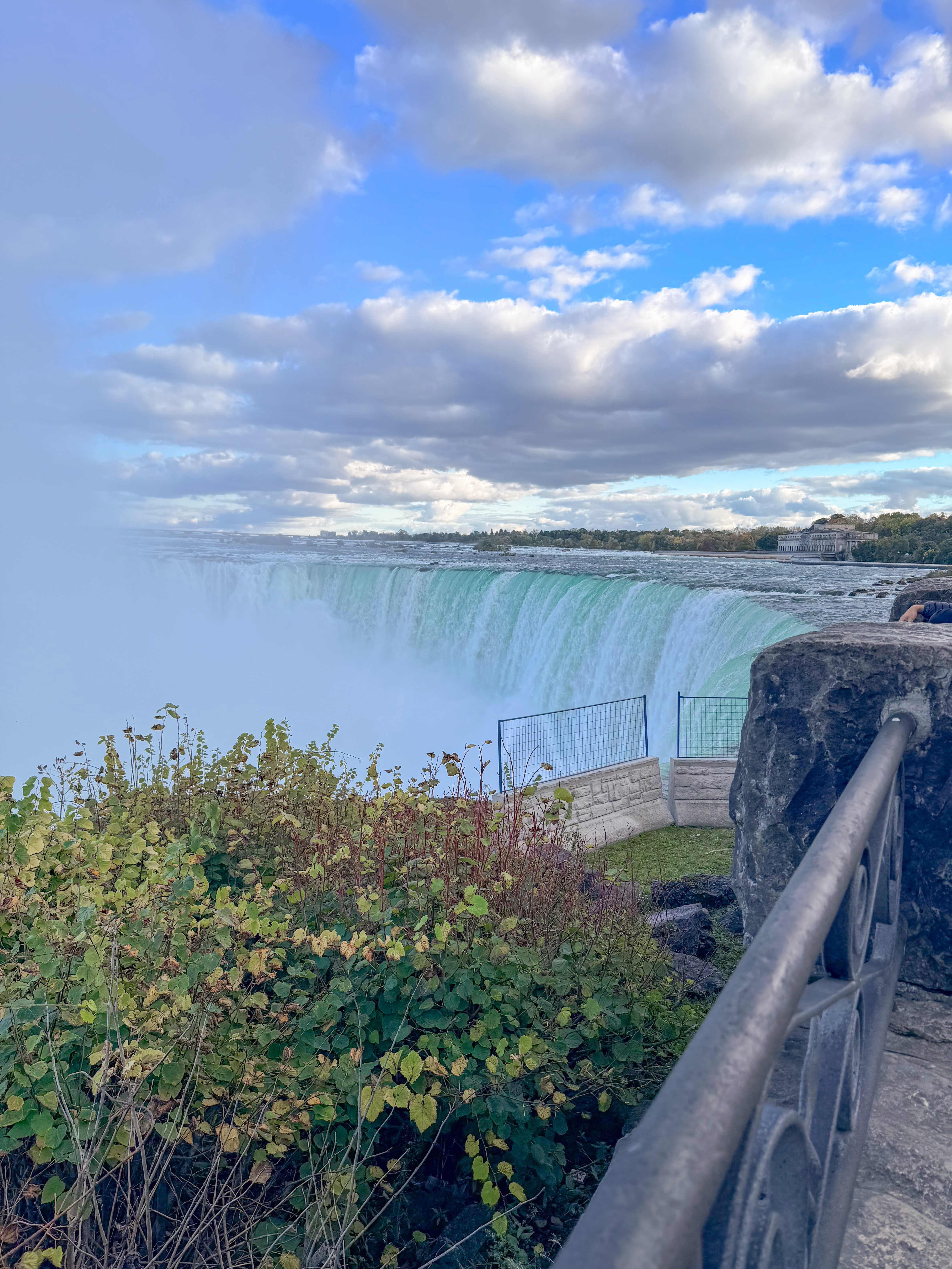 Since we were an hour and a half from Niagara Falls, we decided to visit, knowing that this iconic destination was a highlight of the area. There was rain in the morning, casting a gloomy atmosphere, and since it was in the forecast for other days, we felt this might be our only chance to experience the falls during our trip. After our visit to Cutco Cutlery, where we enjoyed learning about their products and craftsmanship, we set out on a scenic drive filled with anticipation. The landscape was beautiful, and we were delighted to cross the border to view Niagara Falls from the Canadian side, renowned for its breathtaking views. Upon arriving, we found a perfect parking spot, which was a stroke of luck considering how busy the area can get. I quickly made my way to the edge of the falls, feeling the mist on my face and the excitement building as I aimed my camera to capture the stunning visuals. To my delight, there was a vibrant rainbow arcing across the spray of the falls, which made the moment even more magical and memorable. I loved seeing it, as it seemed to embody the beauty and raw power of nature right before me.