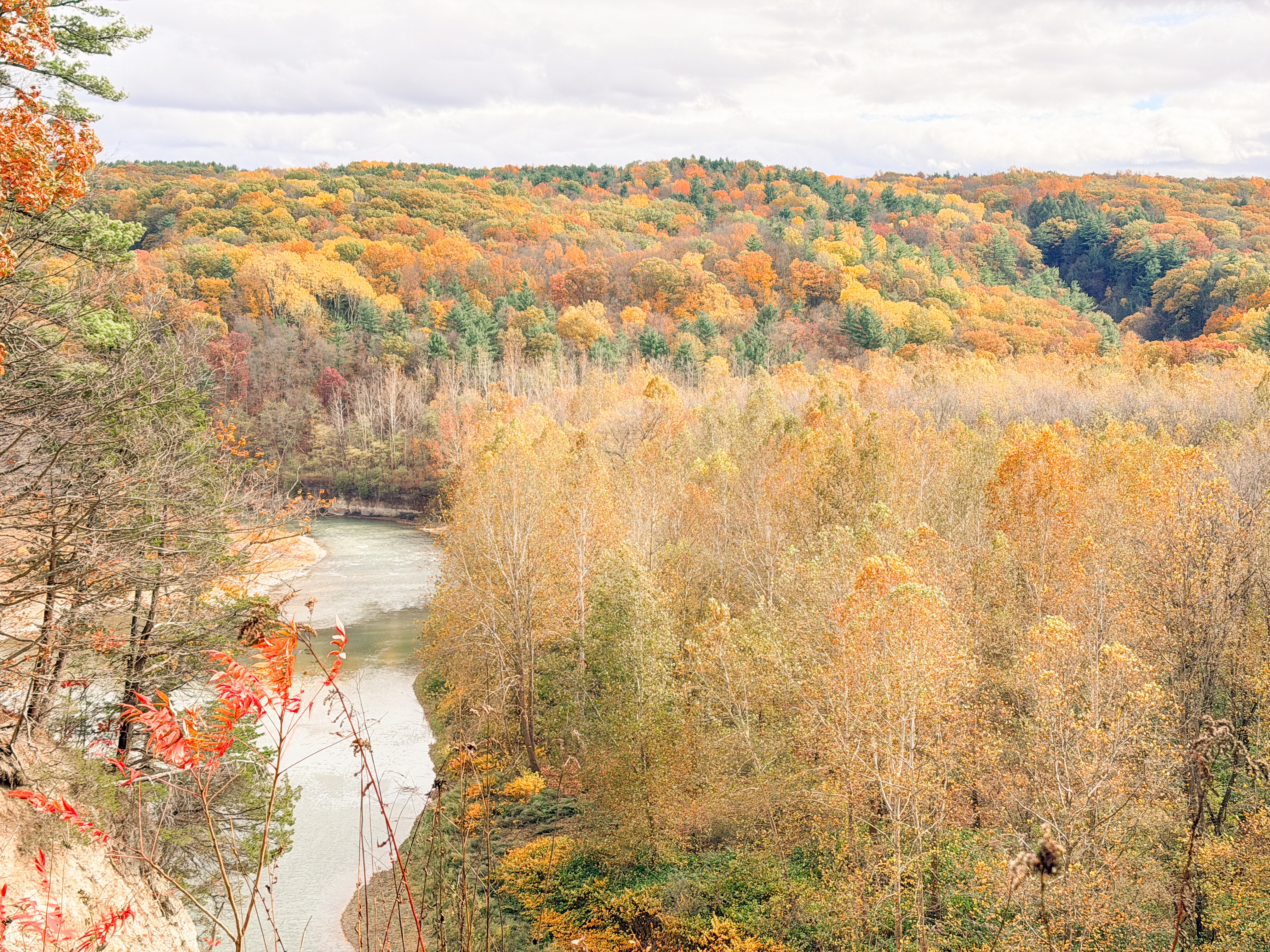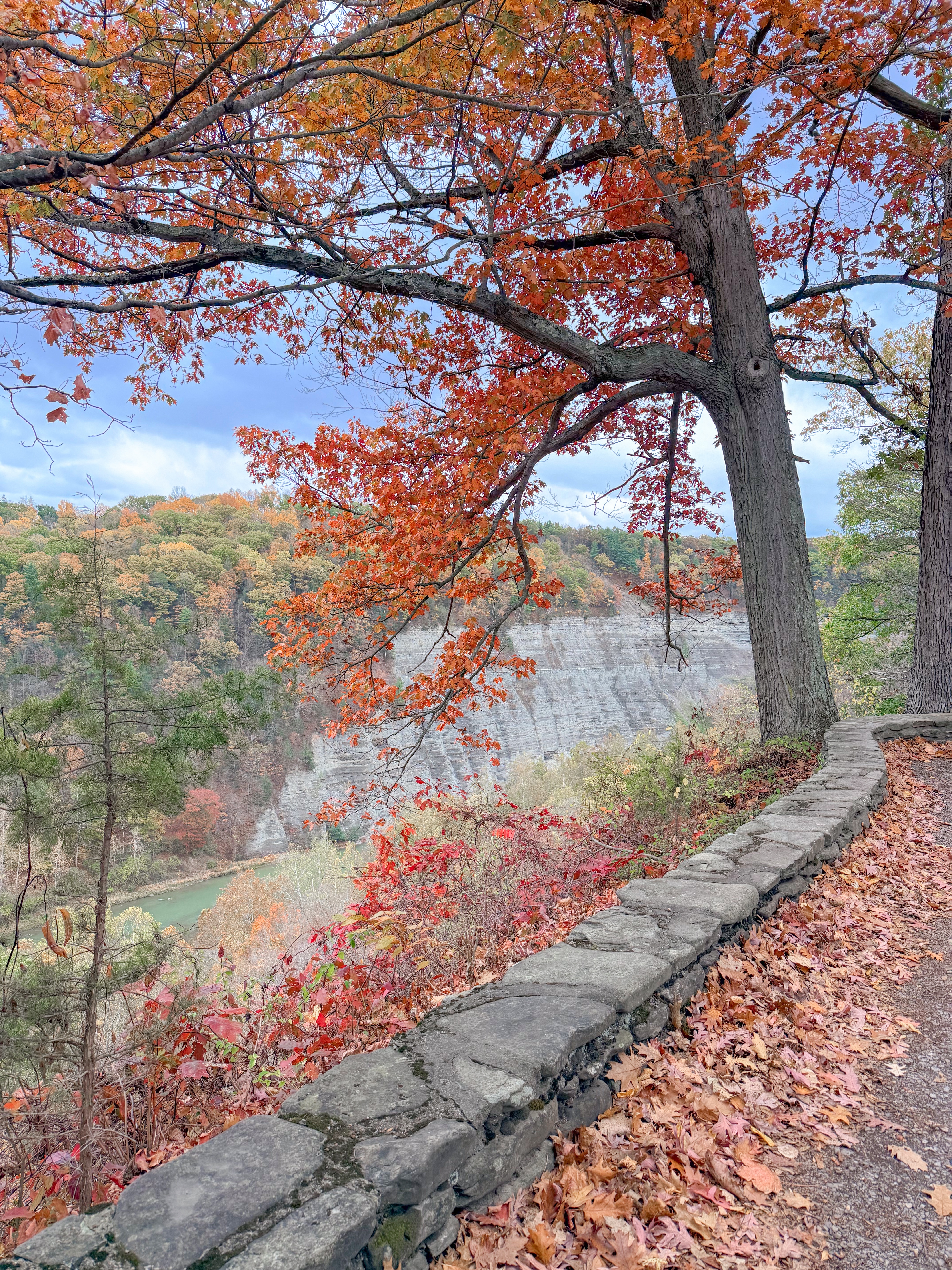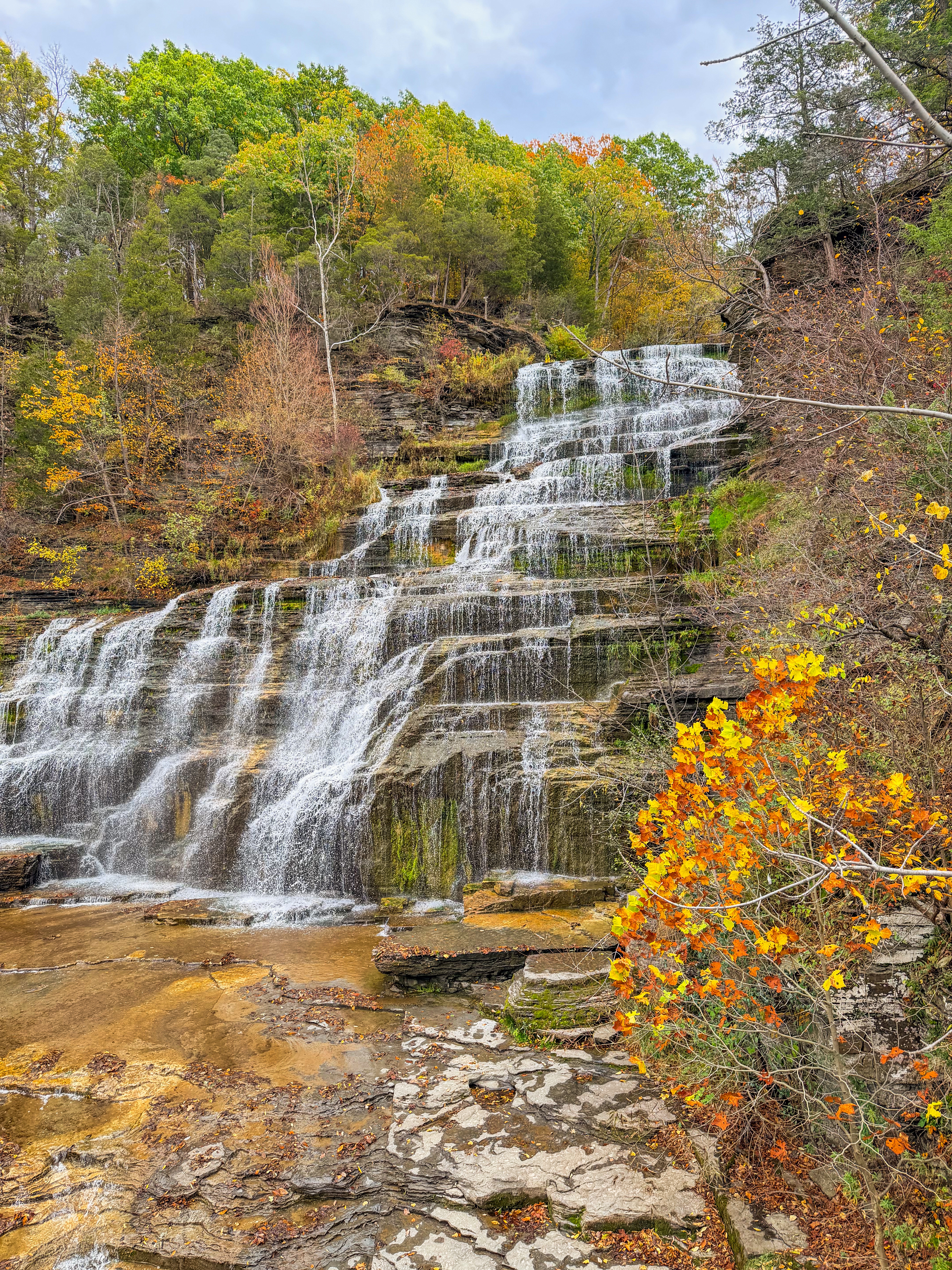 After our delightful visit to Sampson State Park, we were driving back to our cozy VRBO when an unexpected sight caught our attention—a stunning waterfall cascading gracefully on the side of the road. Hector Falls, a hidden gem nestled along the banks of Seneca Lake, is conveniently located on Route 414 North of Watkins Glen. The sight was truly mesmerizing, with the water tumbling down the rocky cliffs. I love the vibrant fall foliage surrounding the falls, with hues of orange, red, and gold painting the landscape. The combination of the roaring water and the colorful leaves created a picturesque scene that felt like something straight out of a postcard, perfect for capturing a few memorable photographs.